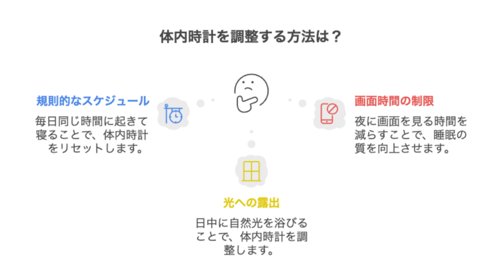 長期的には、起床後すぐに5分日光を浴びる、朝食でタンパク質を摂る、昼間に軽く体を動かすことで、眠れる体質に変わります。