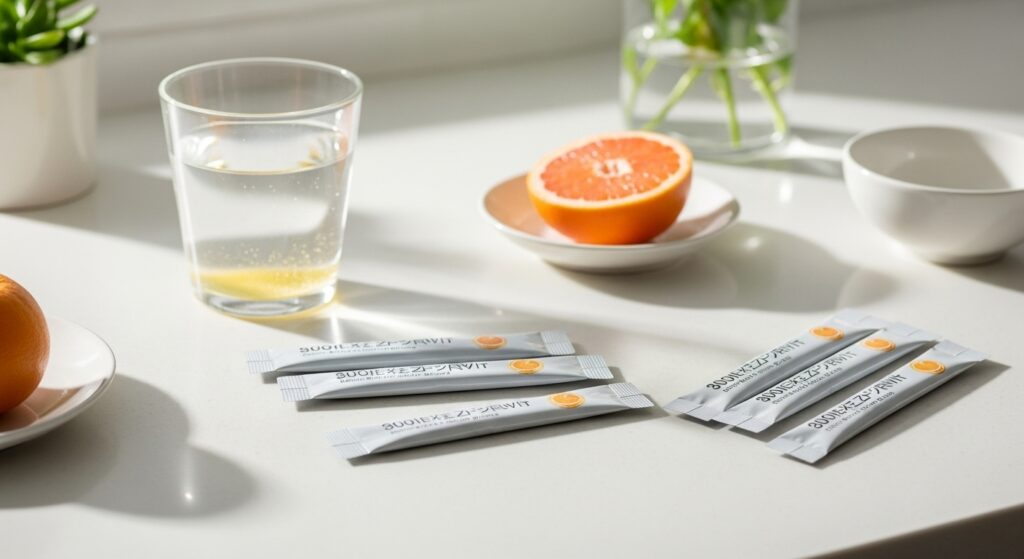 グレープフルーツ味の粉末タイプで、水に溶かして飲みます。