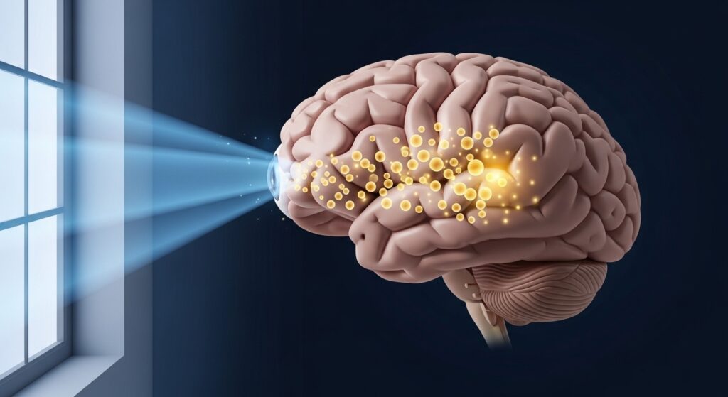 目にわずかな光が入るだけで、脳はメラトニンの分泌にブレーキをかける。